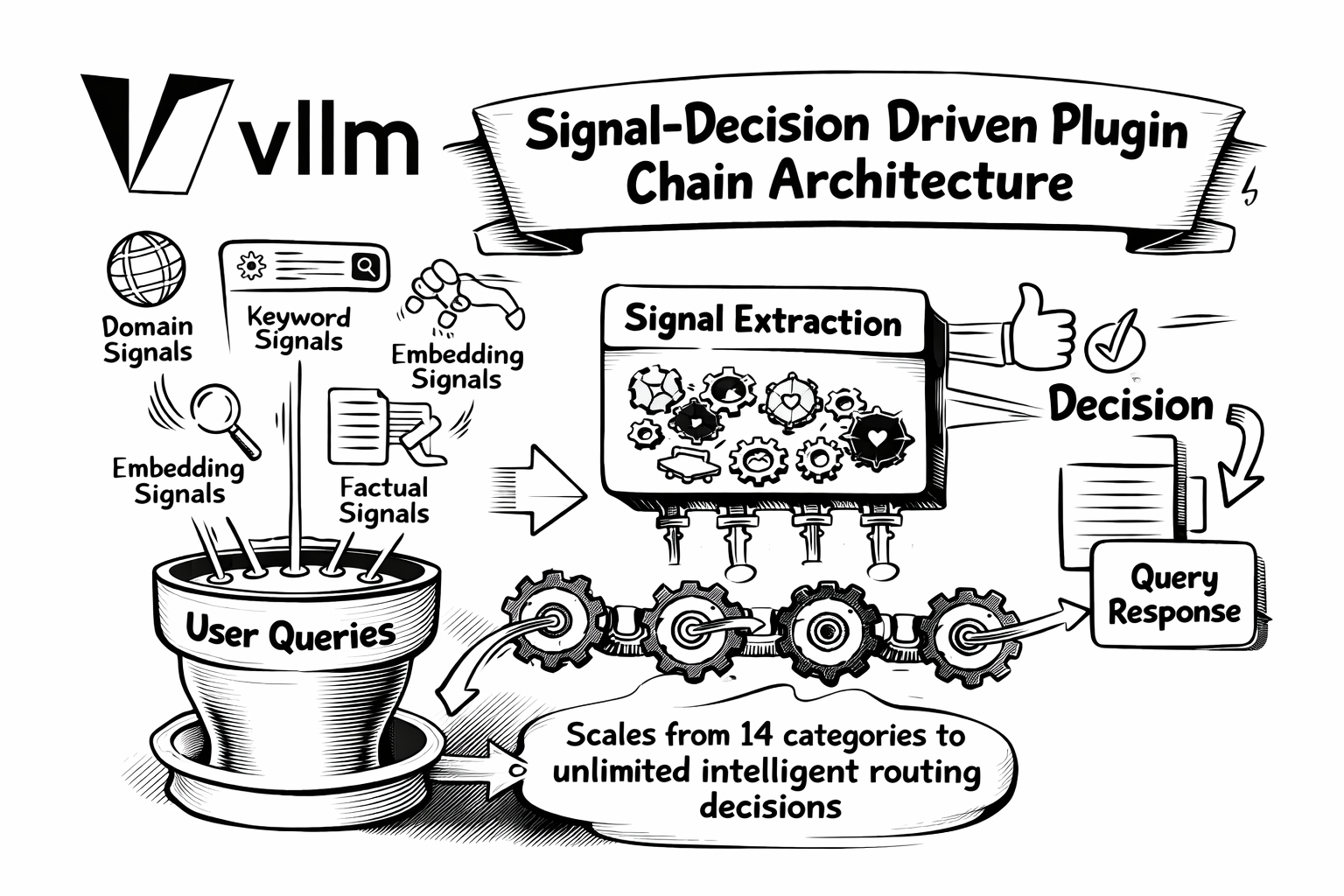 Now: We’ve introduced the Signal-Decision Driven Plugin Chain Architecture, a complete reimagining of semantic routing that scales from 14 fixed categories to unlimited intelligent routing decisions.
